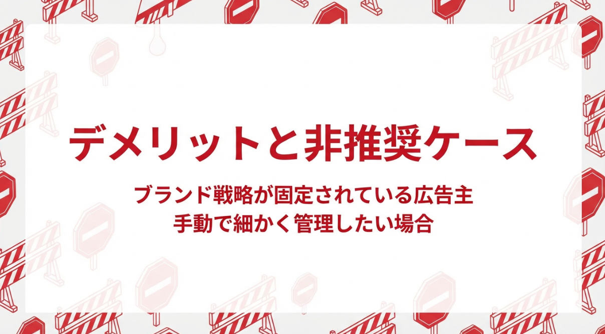 | 広告主規模別の適性判断 | ・中小企業や少人数体制の広告運用:運用工数削減と成果改善が同時に狙える・大手企業やブランド厳守が求められる企業:導入には社内調整やガイドラインの確認が必要 | 分析チームの有無やガバナンス体制に応じて、透明性や制御性の課題を事前に検討 |