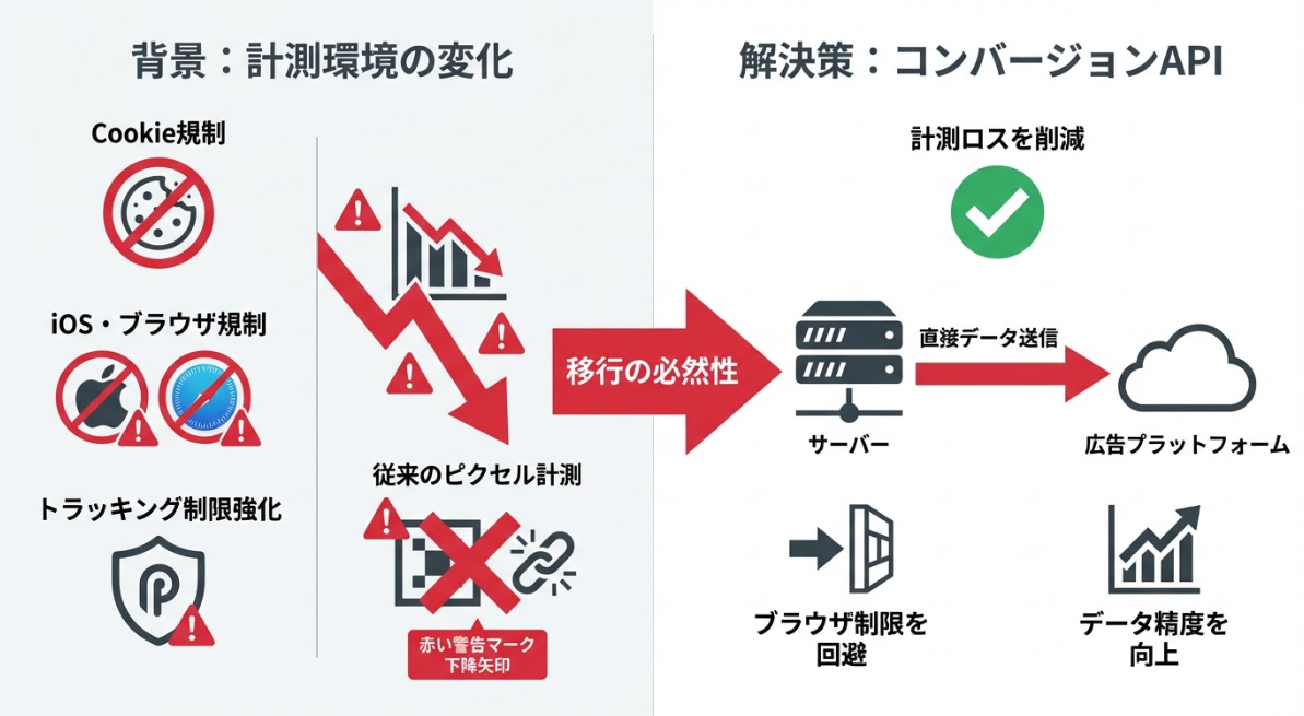 コンバージョンAPIは、Cookie規制やiOSのトラッキング制限といった環境変化に対応するための重要な計測基盤です。