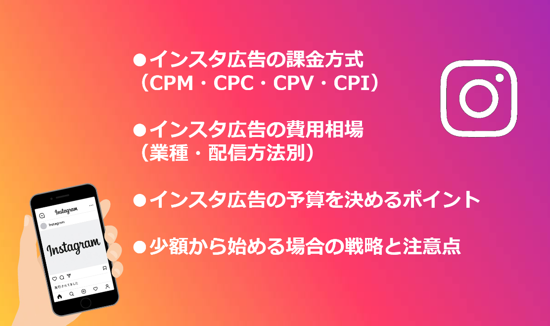 A.Instagram広告は、1日数百円から始められます。課金方式(CPC・CPM・CPA)やターゲット、広告の競合状況によって変動しますが、1クリックあたり30〜100円程度が一般的です。