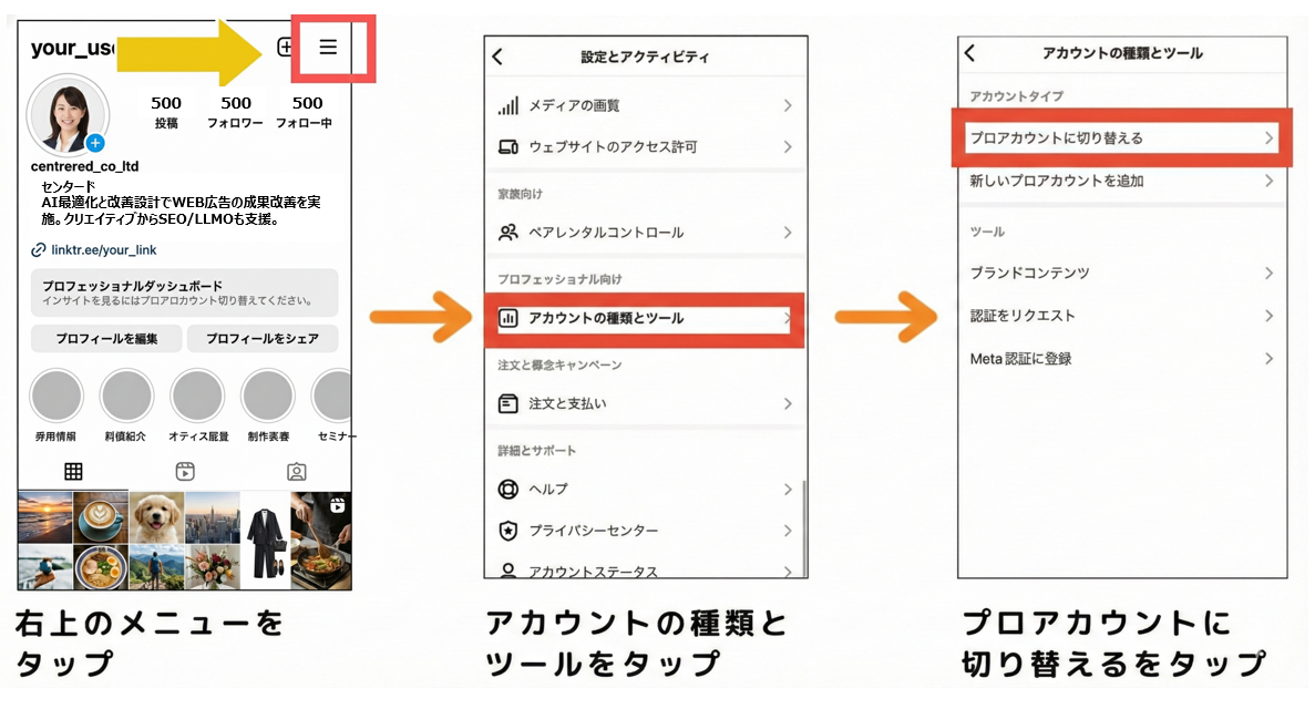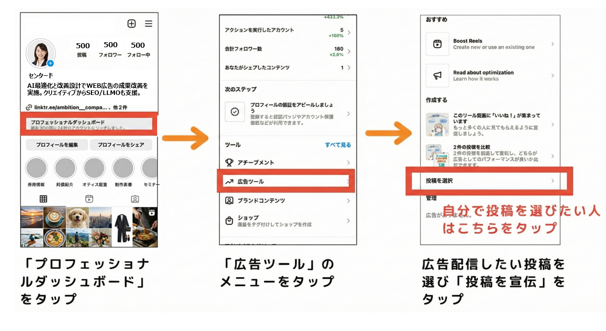 「Instagramでプロアカウントを設定すると、Instagramプロアカウントから広告を掲載できるようになります。また、Meta のツールを使って Instagram および Facebook に表示できます。」