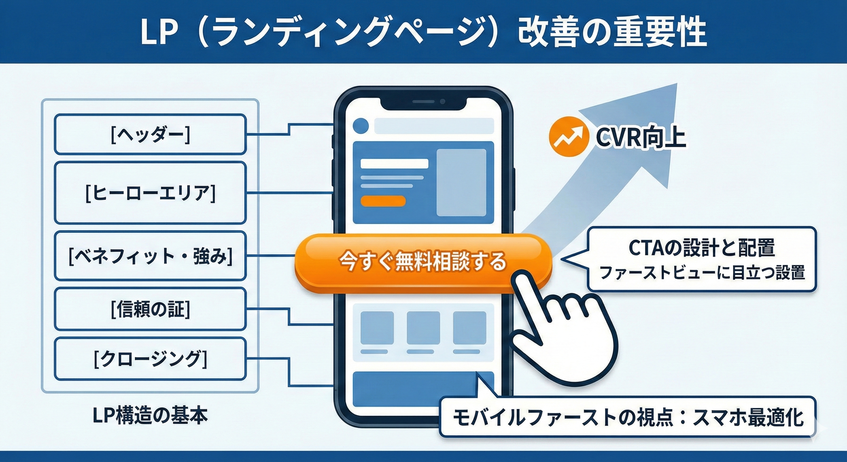 LPの改善は、広告クリック後の最後の勝負所です。広告文との一貫性、行動を促す導線、スマホ最適化という3つの観点を軸に、定期的な見直しとABテストで成果を伸ばしていきましょう。