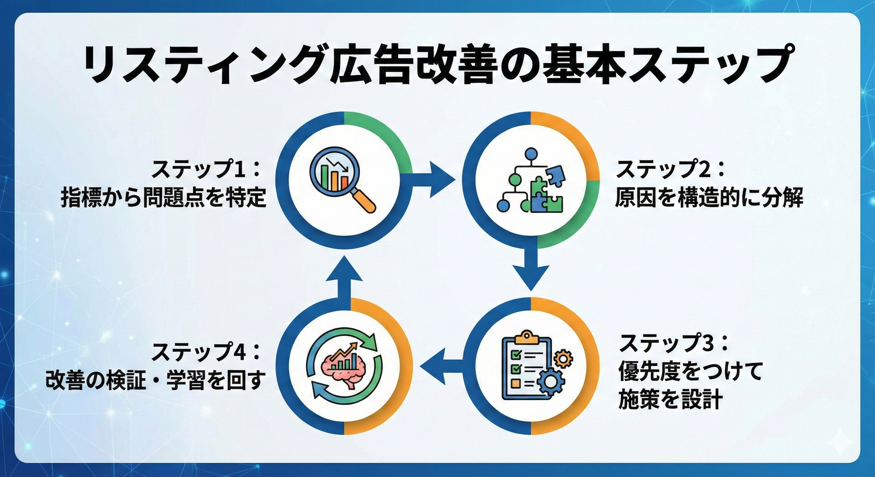 リスティング広告の成果を高めるためには、単に数値を追いかけるだけでなく、構造的な視点から課題を特定し、段階的かつ戦略的に改善を進めていくことが重要です。