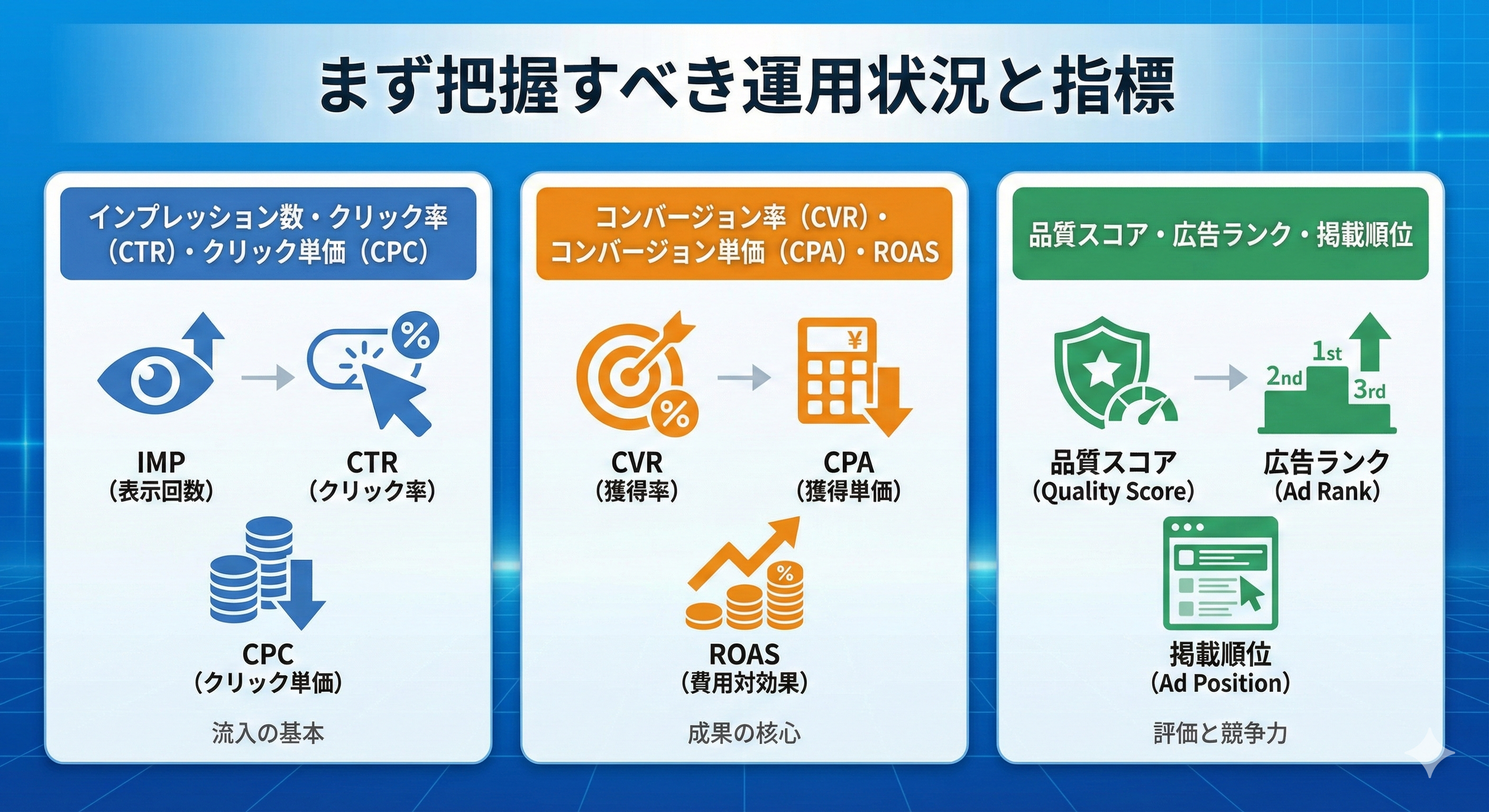 これらの指標は、リスティング広告の「どの段階に課題があるのか」を分析するための土台です。
