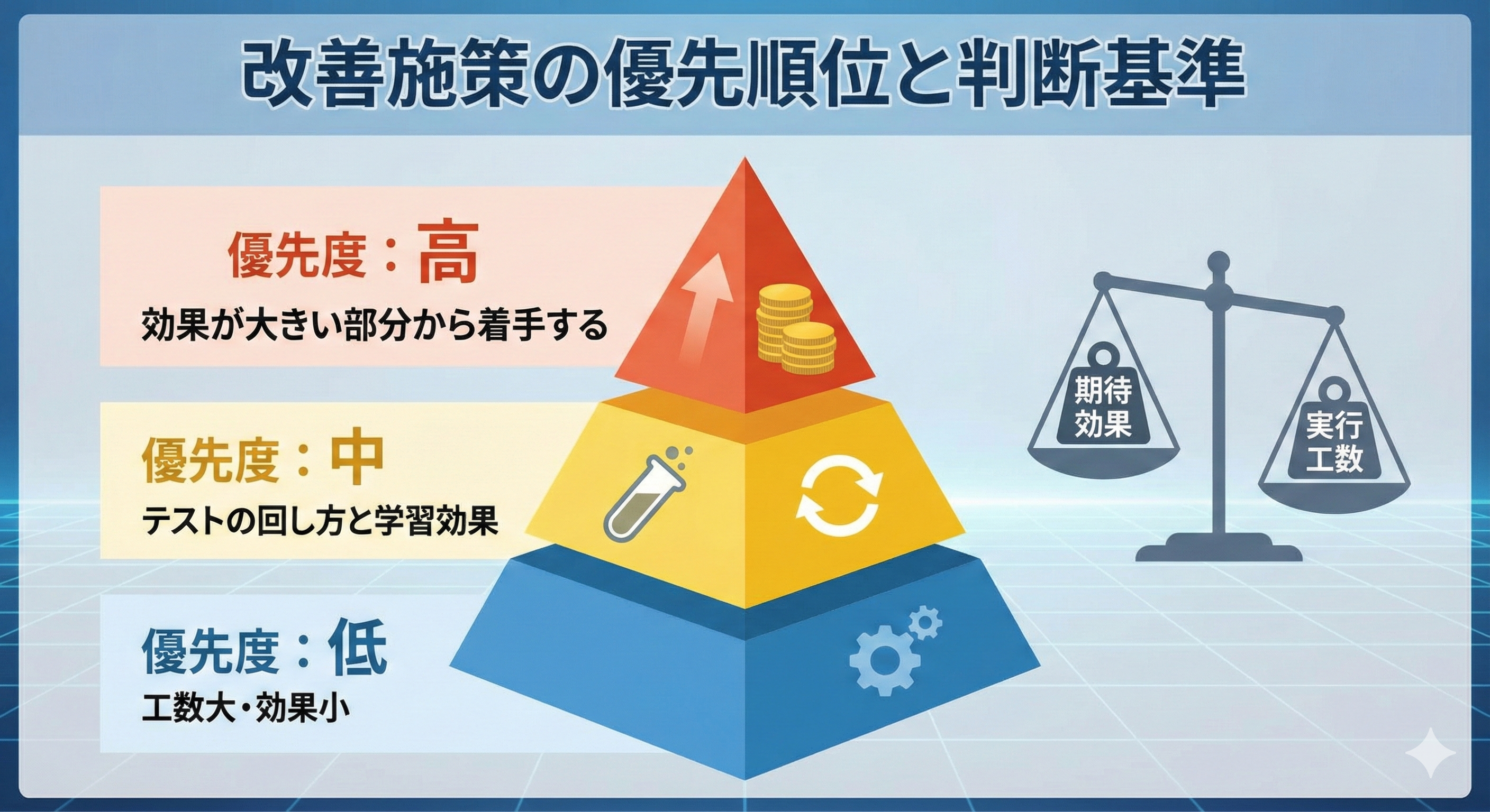 成果に直結するかどうか、実行の負荷はどうかを冷静に見極めることで、無駄な試行錯誤を減らし、改善サイクルをよりスピーディに回せるようになります。