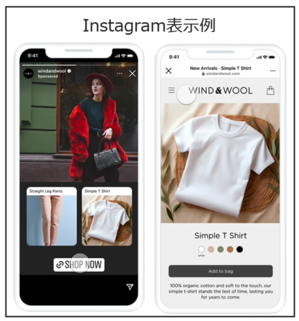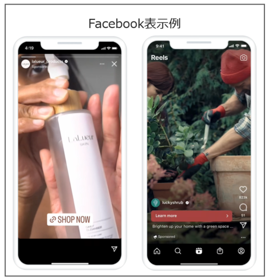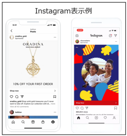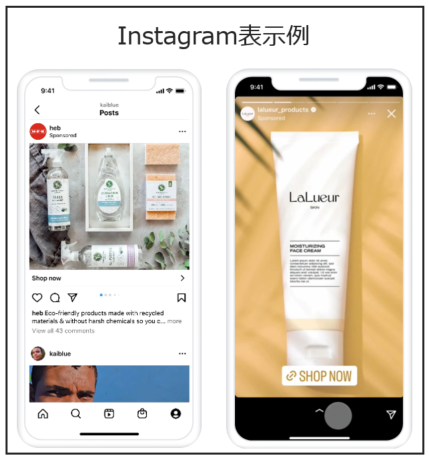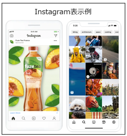 | フィード、ストーリーズ、リール、発見タブ | ビジュアル訴求に最適。ECや美容・旅行などで高い効果を発揮。 | |