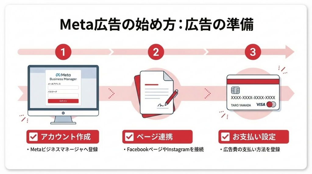 Meta広告を始めるには、まずMeta(旧Facebook)の個人アカウントが必要です。このアカウントをもとに、広告運用に必要な各種設定を行います。